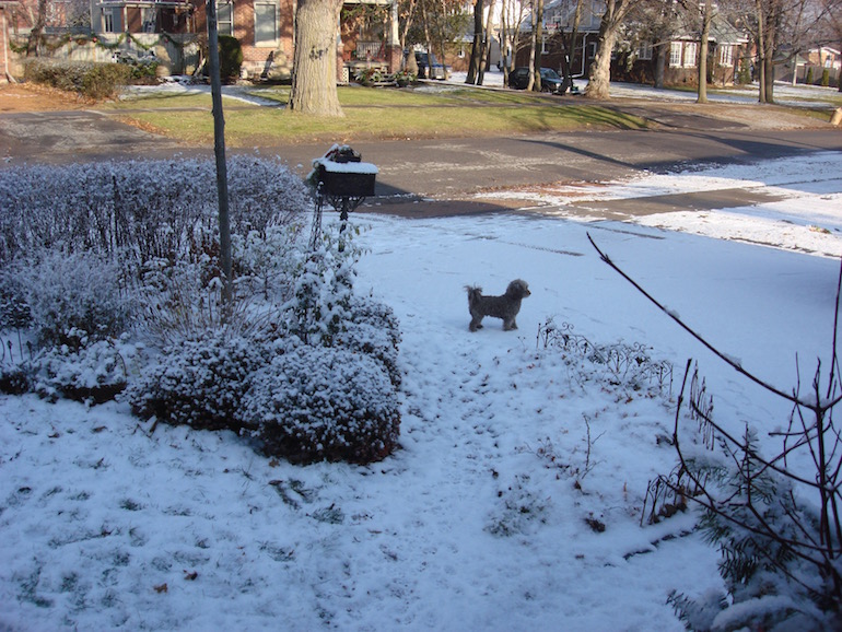… and today, the puppy stands in contemplation while our side of the street hangs possessively on to the snow, and the other side, facing south, has given its snow up to the sun.