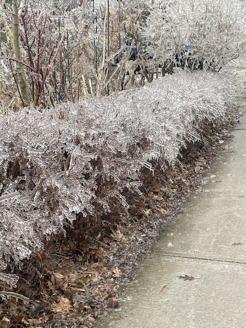 It's tempting to shake the ice off branches....we feel sorry for the weight these fragile branches have to bear but this can actually do more damage than leaving the ice to melt off on its own. Some heavier branches may break under the weight, but the smaller ones will likely have enough new sap in their tips to bend not break, where new little buds have started... Shaking off the ice from these can damage the wee buds where the smaller branches will stand back up and be fine.