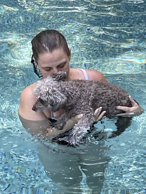 We think Lucy liked the pool. ... she swam and floated around but was also happy to be wrapped in a towel and warm up in the sun
