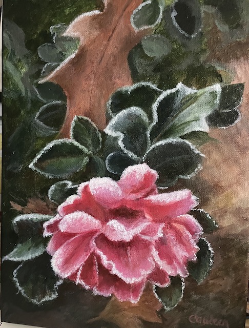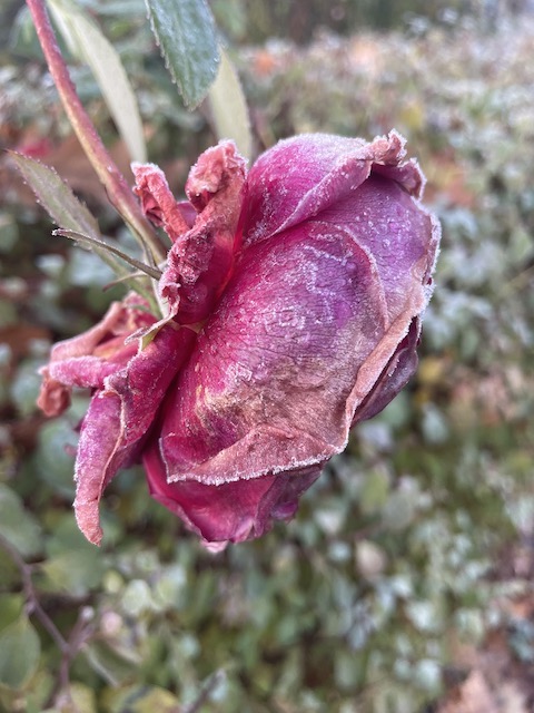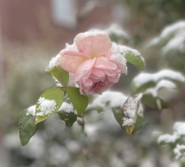 Remember? This was one of the last roses of summer that insisted on leaning over the hedge to snag anyone passing by. Even in late November, the scent was still heady and glorious. ("Shakespeare" rose) .... and now, in early December, here it is, succumbing to the cold and still smelling gloriously like a rose. How lovely