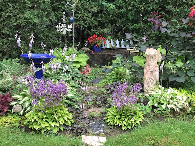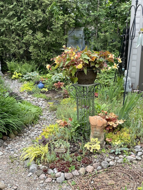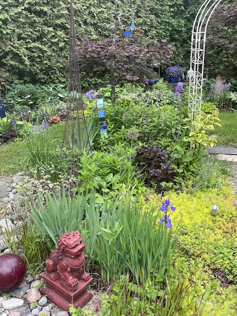 Colour in our Gardens...There are many ways to use colour.... flowers, plant leaves, or fun things. It helps to thread colour throughout your garden so your eye will start in one place and then lead to another... and another .. like the colour burgundy here...see how the front deep burgundy Heuchera leads your eye to the burgundy of the Redbud leaves?