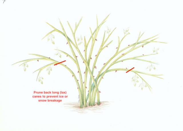Long ("lax") canes may reach over a path or walkway and snag your coat... or your pet... prune them back just enough to keep them out of the way.