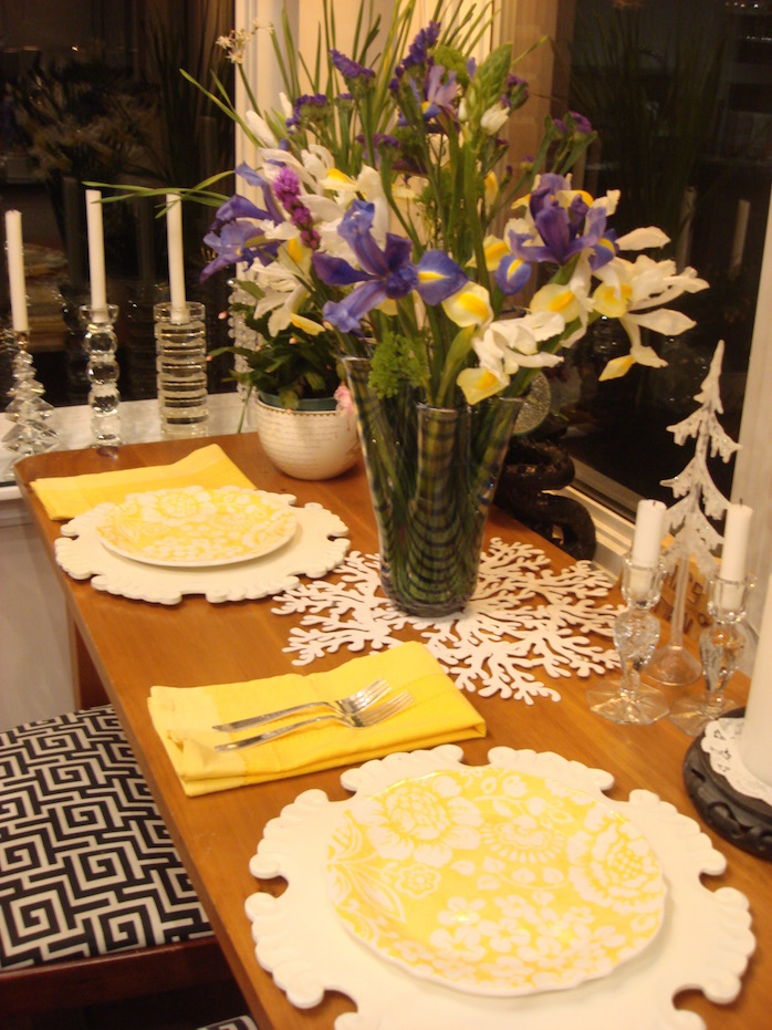 Get out your cheeriest dishes, and indulge in a bouquet of sunny flowers. If we lived in jolly-old England, perhaps we would have snowdrops by now, but down the road from here, is a nice shop full of lovely flowers and for the price of a pound of really good coffee, you could have a whole bouquet like this.