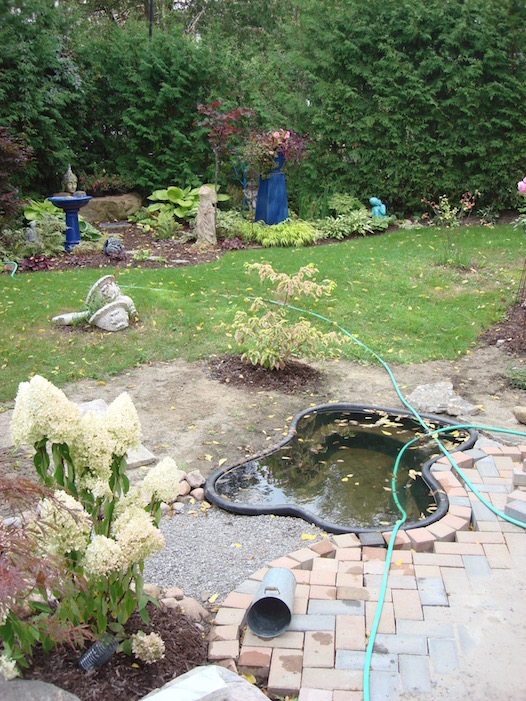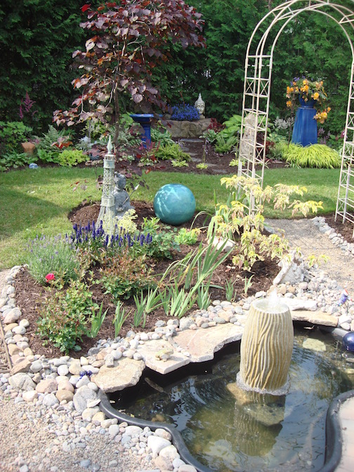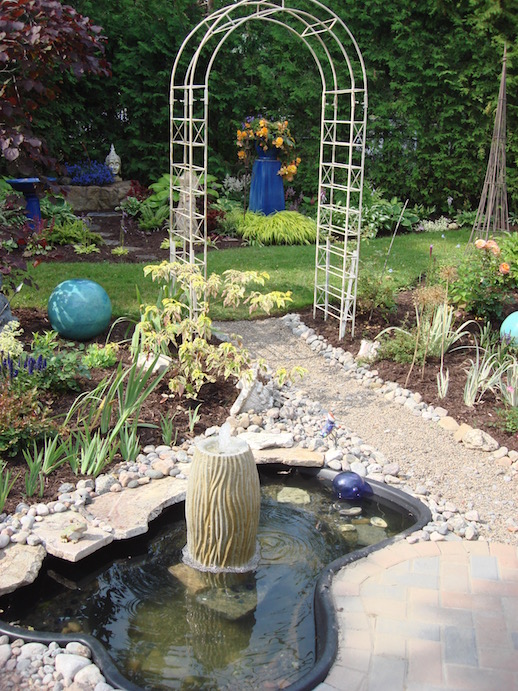 The pond, unused in a friend's barn; the arbour from a wedding planner; the fountain from the back-40 of a landscape company's trash heap and the pieces of marble are cast-offs from a counter-top company.