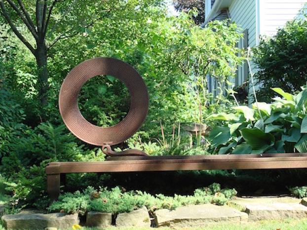 a found object, birdbath, or a funky piece of scrap iron, a brightly painted chair with a pot of flowers in the seat.